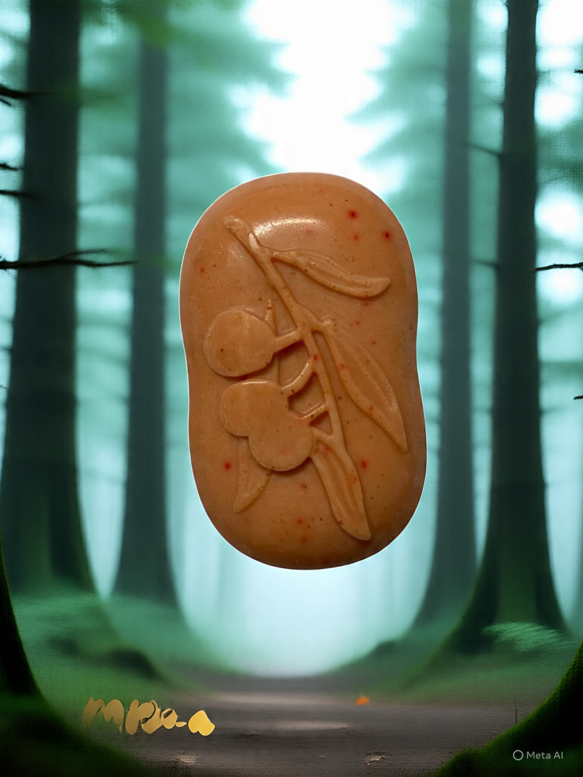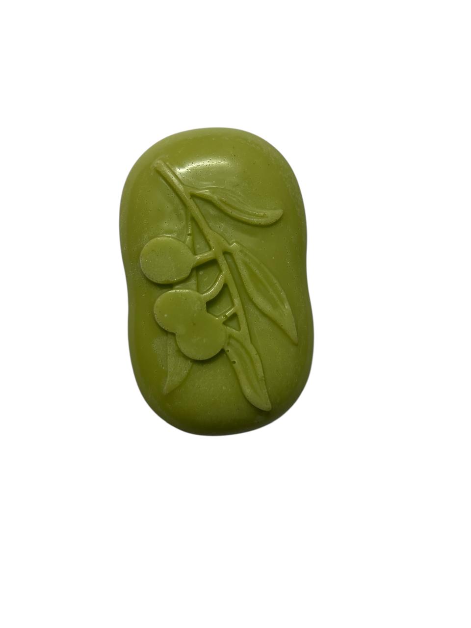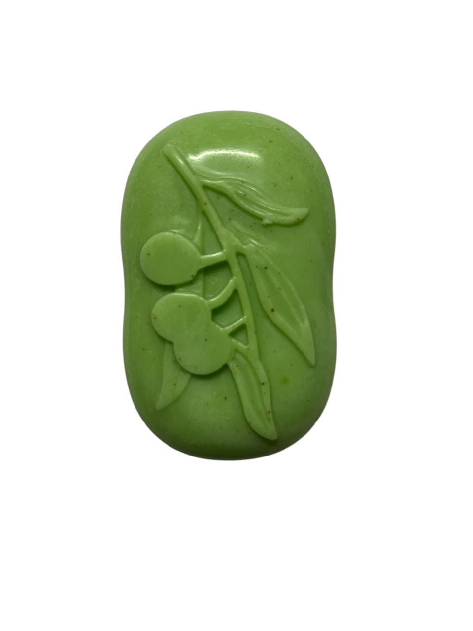 The soap is labeled as “Cherry Bunch – Regular Edition ” and appears to be a handcrafted product. The design of the soap features a cherry branch with leaves and cherries, which suggests that the soap may contain natural ingredients such as cherry extract or essential oils. The Design is simple yet elegant, making is visually appealing .The benefits of using this soap may include soothing and calming irritated skin , Antioxidant properties from the cherry extract or essential oil, Gentle and non-irritating formula suitable foe sensitive skin .